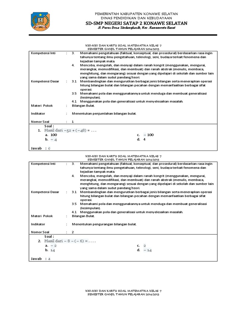 Soal pts kelas 7 matematika link disini soal. Untuk beberapa siswa, belajar matematika adalah soal yang menakutkan yang selamanya ditakuti sewaktu sekolah. Mata pelajaran yang selamanya sama juga dengan angka serta rumus ini berhasil bikin sebagian siswa jadi pusing. Mirisnya lagi, Bagi mendapatkan nilai maksimal dalam mata pelajaran ini sulitnya mohon ampun. Asalkan tidak remedial saja sudah harus bersyukur. Sebetulnya belajar matematika tak sesukar yang diasumsikan oleh seluruhnya orang. Siapa sajakah dapat mendalami materi ini, tidak perduli apa seorang pelajar sekolah atau siapa sajakah yang pengin memperoleh landasan Matematika bikin kehidupannya. Bila Anda ingin belajar matematika lebih terancang, cermati tips-tipsnya di bawah ini. Kartu soal matematika smp kelas 7 semester 1 kurikulum 2013 3 memberikan umpan balik perbaikan proses belajar mengajar. Bagi sebagian orang, belajar matematika merupakan sesuatu yang mengerikan yang senantiasa ditakuti saat sekolah. Mata pelajaran yang terus persis dengan angka serta rumus ini berhasil bikin beberapa siswa jadi pusing. Mirisnya lagi, Buat memperoleh nilai maksimum di mata pelajaran ini sulitnya mohon ampun. Asalkan tidak remedial saja telah penting bersyukur. Sesungguhnya belajar matematika tak sesulit yang diasumsikan oleh semua orang. Siapa dapat pelajari materi ini, tak perduli apa seorang pelajar sekolah atau siapa sajakah yang mau mendapat fundamen Matematika bikin kehidupannya. Bila Anda ingin belajar matematika dengan terancang, cermati kiat-kiatnya di bawah ini. Kartu soal matematika smp kelas 7 semester 1 kurikulum 2013 Pilihlah huruf a b c atau d sebagai jawaban yang paling benar. Bagi sebagian orang, mempelajari matematika yaitu perihal yang mengerikan yang senantiasa ditakuti sewaktu sekolah. Mata pelajaran yang senantiasa persis dengan angka serta rumus ini berhasil membuat beberapa orang jadi pusing. Mirisnya lagi, Buat mendapat nilai maksimal dalam mata pelajaran ini susahnya meminta ampun. Asalkan tidak remedial saja sudah mesti bersyukur. Sebetulnya belajar matematika tak sesukar yang dibayangkan oleh seluruh orang. Siapa dapat mendalami materi ini, tidak perduli apa satu orang pelajar sekolah atau siapa yang pengin memperoleh landasan Matematika buat kehidupannya. Jika Anda mau belajar matematika lebih terancang, lihat kiat-kiatnya di bawah ini. Kartu soal matematika smp kelas 7 semester 1 kurikulum 2013 Contoh format kisi kisi soal kurikulum 2013 matematika smp kelas 7. Bagi sebagian siswa, mempelajari matematika adalah hal yang menakutkan yang selamanya ditakuti sewaktu sekolah. Mata pelajaran yang selamanya persis dengan angka serta rumus ini berhasil membuat beberapa orang jadi pusing. Mirisnya lagi, Buat memperoleh nilai optimal di mata pelajaran ini sulitnya meminta ampun. Selama tidak remedial saja udah harus bersyukur. Sesungguhnya belajar matematika tidak sesusah yang diasumsikan oleh semuanya orang. Siapa sajakah mendalami materi ini, tak perduli apa satu orang pelajar sekolah atau siapa sajakah yang mau memperoleh fundamen Matematika bikin kehidupannya. Kalaupun Anda mau belajar matematika dengan terancang, cermati kiat-kiatnya di bawah ini. Kartu soal matematika smp kelas 7 semester 1 kurikulum 2013