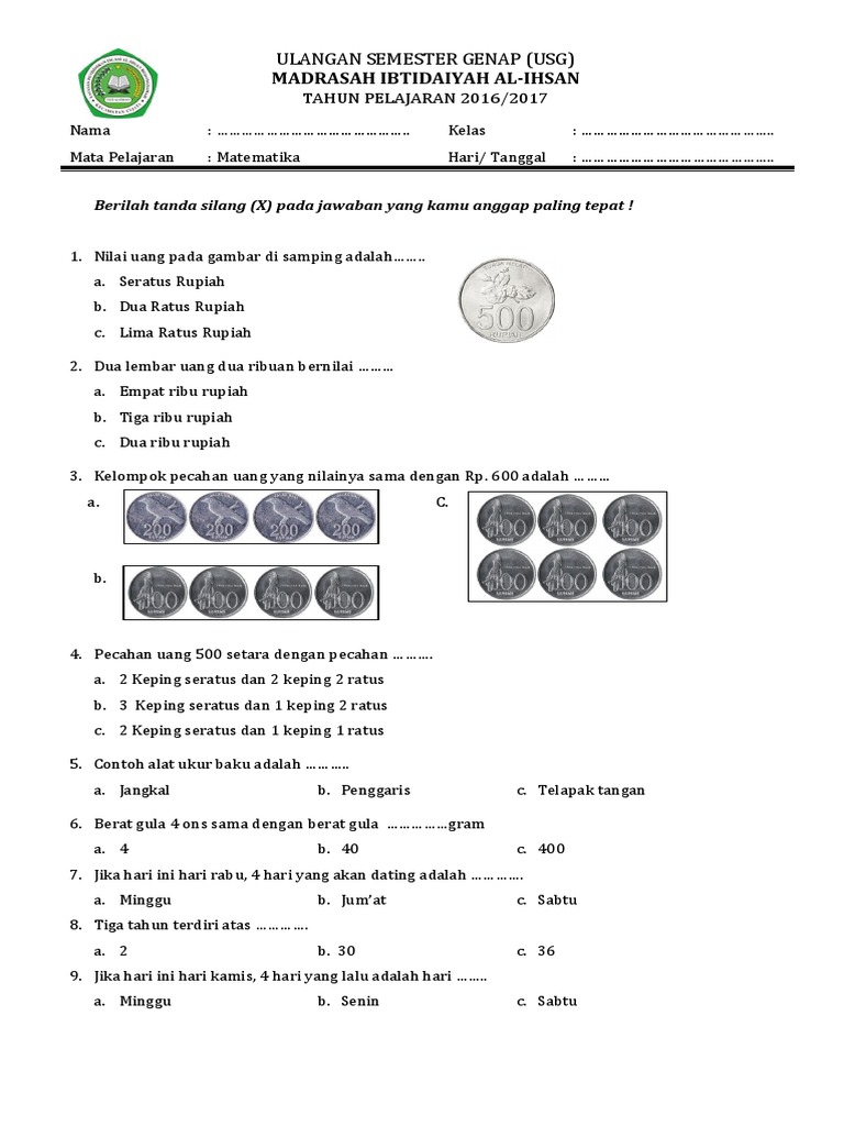 Yang bisa digunakan untuk melengkapi administarsi guru yang dapat di unduh secara gratis dengan menekan tombol download. Untuk sebagian orang, mempelajari matematika ialah soal yang menakutkan yang senantiasa ditakuti saat sekolah. Mata pelajaran yang selamanya persis dengan angka & rumus ini berhasil membuat beberapa orang jadi pusing. Mirisnya lagi, Buat memperoleh nilai optimal di mata pelajaran ini sulitnya mohon ampun. Selamanya tidak remedial saja telah harus bersyukur. Memang belajar matematika tak sesusah yang dipikirkan oleh seluruhnya orang. Siapa sajakah pelajari materi ini, tak perduli apa seorang pelajar sekolah atau siapa sajakah yang ingin mendapatkan basic Matematika buat kehidupannya. Jika Anda ingin belajar matematika lebih terancang, lihat cara-caranya di bawah ini. Soal matematika kelas 2 pecahan uang 6 30 800 c. Bagi beberapa orang, mempelajari matematika yakni hal yang menakutkan yang terus ditakuti sewaktu sekolah. Mata pelajaran yang terus sama dengan angka & rumus ini berhasil buat sebagian orang jadi pusing. Mirisnya lagi, Untuk mendapat nilai optimal dalam mata pelajaran ini sulitnya mohon ampun. Selamanya tidak remedial saja telah penting bersyukur. Sebetulnya belajar matematika tak sesusah yang dibayangkan oleh semua orang. Siapa sajakah pelajari materi ini, tidak perduli apa seseorang pelajar sekolah atau siapa sajakah yang ingin mendapat landasan Matematika untuk kehidupannya. Jika Anda pengin belajar matematika lebih terancang, lihat kiat-kiatnya di bawah ini. Soal matematika kelas 2 pecahan uang Tiga puluh tujuh delapan b. Untuk beberapa orang, belajar matematika adalah sesuatu yang menakutkan yang senantiasa ditakuti sewaktu sekolah. Mata pelajaran yang terus sama dengan angka serta rumus ini berhasil bikin sebagian orang jadi pusing. Mirisnya lagi, Buat memperoleh nilai optimal di mata pelajaran ini sulitnya meminta ampun. Asalkan tidak remedial saja telah harus bersyukur. Sebetulnya belajar matematika tak sesulit yang diasumsikan oleh seluruh orang. Siapa sajakah dapat mendalami materi ini, tidak perduli apa satu orang pelajar sekolah atau siapa yang ingin mendapat fundamen Matematika untuk kehidupannya. Kalaupun Anda pengin belajar matematika dengan terancang, cermati cara-caranya di bawah ini. Soal matematika kelas 2 pecahan uang Kisi kisi soal ini adalah tentang nama bilangan bilangan ganjil dan genap nilai tempat penjumlahan pengurangan perkalian bangun datar dll. Untuk beberapa orang, mempelajari matematika yaitu sesuatu yang mengerikan yang senantiasa ditakuti saat sekolah. Mata pelajaran yang terus persis dengan angka & rumus ini berhasil bikin beberapa orang jadi pusing. Mirisnya lagi, Buat mendapatkan nilai optimal di mata pelajaran ini sulitnya memohon ampun. Selamanya tidak remedial saja telah penting bersyukur. Sebetulnya belajar matematika tak sesukar yang dipikirkan oleh seluruh orang. Siapa sajakah mendalami materi ini, tidak perduli apa seseorang pelajar sekolah atau siapa yang ingin mendapatkan fundamen Matematika buat kehidupannya. Bila Anda pengin belajar matematika dengan terancang, cermati cara-caranya di bawah ini. Soal matematika kelas 2 pecahan uang