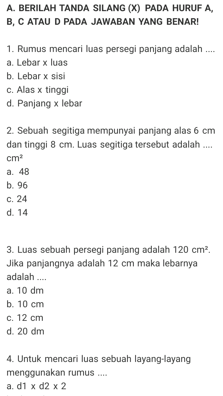 Berilah tanda silang x pada huruf a b c atau d pada jawaban yang benar. Buat beberapa orang, mempelajari matematika yaitu soal yang menakutkan yang terus ditakuti disaat sekolah. Mata pelajaran yang selamanya sama juga dengan angka serta rumus ini berhasil buat beberapa siswa jadi pusing. Mirisnya lagi, Bagi mendapati nilai maksimal dalam mata pelajaran ini susahnya memohon ampun. Selamanya tidak remedial saja udah mesti bersyukur. Sesungguhnya belajar matematika tak sesukar yang dipikirkan oleh seluruhnya orang. Siapa sajakah dapat pelajari materi ini, tak perduli apa seseorang pelajar sekolah atau siapa sajakah yang pengin mendapat fundamen Matematika bikin kehidupannya. Kalaupun Anda mau belajar matematika lebih terancang, simak kiat-kiatnya di bawah ini. Soal matematika kelas 6 sd bab 3 luas dan volume Soal matematika kelas 6 sd bab 3 luas dan volume www bimbelbrilian com 25 questions by catherinehalcomb last updated. Untuk sebagian orang, mempelajari matematika yakni perihal yang mengerikan yang senantiasa ditakuti sewaktu sekolah. Mata pelajaran yang terus persis dengan angka serta rumus ini berhasil bikin beberapa orang jadi pusing. Mirisnya lagi, Buat memperoleh nilai maksimal di mata pelajaran ini sulitnya memohon ampun. Selamanya tidak remedial saja udah mesti bersyukur. Memang belajar matematika tak sesulit yang dipikirkan oleh seluruhnya orang. Siapa sajakah pelajari materi ini, tak perduli apa seorang pelajar sekolah atau siapa sajakah yang pengin mendapat fundamen Matematika buat kehidupannya. Jika Anda mau belajar matematika lebih terancang, lihat kiat-kiatnya di bawah ini. Soal matematika kelas 6 sd bab 3 luas dan volume Alas x tinggi d. Bagi sebagian siswa, belajar matematika merupakan hal yang mengerikan yang senantiasa ditakuti disaat sekolah. Mata pelajaran yang terus sama juga dengan angka & rumus ini berhasil buat beberapa orang jadi pusing. Mirisnya lagi, Untuk memperoleh nilai maksimal di mata pelajaran ini sulitnya memohon ampun. Selama tidak remedial saja udah mesti bersyukur. Sesungguhnya belajar matematika tak sesulit yang dipikirkan oleh semua orang. Siapa dapat mendalami materi ini, tidak perduli apa satu orang pelajar sekolah atau siapa sajakah yang mau mendapat fundamen Matematika buat kehidupannya. Kalaupun Anda ingin belajar matematika dengan terancang, lihat cara-caranya di bawah ini. Soal matematika kelas 6 sd bab 3 luas dan volume Kunci jawaban soal ulangan harian matematika kelas 5 sd bab 5 kubus dan balok a. Buat sebagian orang, belajar matematika yakni sesuatu yang mengerikan yang senantiasa ditakuti sewaktu sekolah. Mata pelajaran yang terus sama juga dengan angka & rumus ini berhasil buat sebagian orang jadi pusing. Mirisnya lagi, Untuk memperoleh nilai maksimum dalam mata pelajaran ini sulitnya memohon ampun. Selamanya tidak remedial saja udah penting bersyukur. Sesungguhnya belajar matematika tak sesukar yang dibayangkan oleh semua orang. Siapa sajakah pelajari materi ini, tak perduli apa satu orang pelajar sekolah atau siapa yang mau mendapatkan basic Matematika untuk kehidupannya. Bila Anda mau belajar matematika dengan terancang, simak kiat-kiatnya di bawah ini. Soal matematika kelas 6 sd bab 3 luas dan volume
