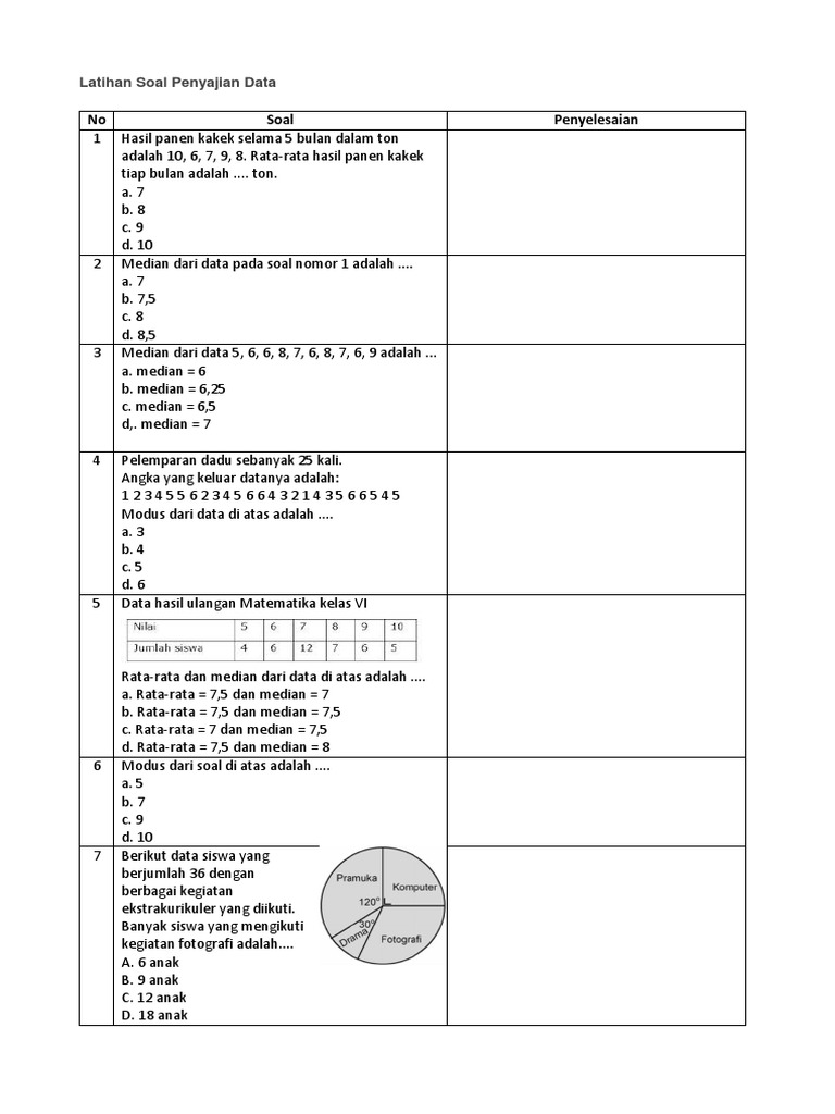 Secara umum statistika merupakan cabang ilmu yang mempelajari bagaimana merencanakan mengumpulkan menganalisis menginterpretasi dan mempresentasikan data. Bagi beberapa orang, belajar matematika ialah soal yang mengerikan yang selamanya ditakuti saat sekolah. Mata pelajaran yang selamanya sama juga dengan angka & rumus ini berhasil bikin sebagian orang jadi pusing. Mirisnya lagi, Bagi memperoleh nilai optimal dalam mata pelajaran ini susahnya mohon ampun. Asalkan tidak remedial saja telah mesti bersyukur. Sebetulnya belajar matematika tak sesulit yang dipikirkan oleh semua orang. Siapa dapat pelajari materi ini, tidak perduli apa seseorang pelajar sekolah atau siapa sajakah yang mau mendapatkan fundamen Matematika bikin kehidupannya. Kalaupun Anda ingin belajar matematika dengan terancang, cermati cara-caranya di bawah ini. Soal matematika kelas 7 penyajian data