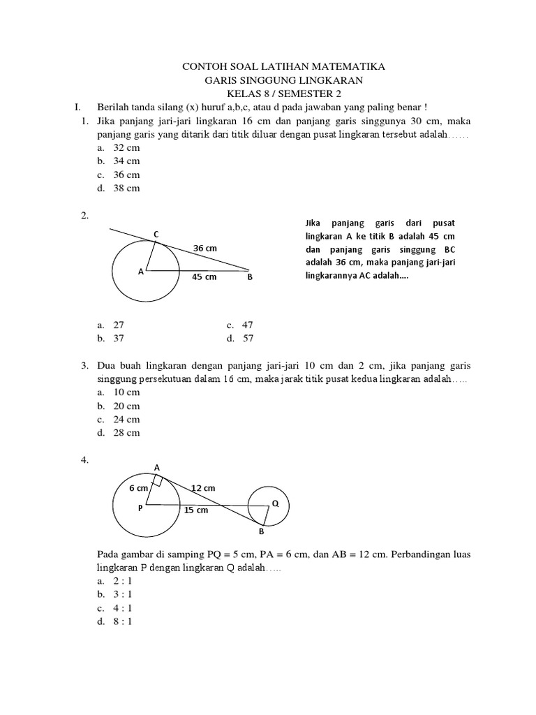 Soal matematika smp kelas 8 garis singgung lingkaran. 7 un matematika smp mts tahun 2008 panjang garis singgung persekutuan dalam dua lingkaran 8 cm. Untuk sebagian siswa, belajar matematika yaitu hal yang menakutkan yang terus ditakuti disaat sekolah. Mata pelajaran yang senantiasa persis dengan angka serta rumus ini berhasil bikin beberapa orang jadi pusing. Mirisnya lagi, Untuk memperoleh nilai optimal di mata pelajaran ini sulitnya meminta ampun. Selamanya tidak remedial saja telah penting bersyukur. Sesungguhnya belajar matematika tidak sesusah yang dibayangkan oleh semuanya orang. Siapa mendalami materi ini, tak perduli apa seorang pelajar sekolah atau siapa sajakah yang mau mendapat basic Matematika untuk kehidupannya. Bila Anda ingin belajar matematika dengan terancang, lihat kiat-kiatnya di bawah ini. Soal matematika smp kelas 8 garis singgung lingkaran Garis singgung persekutuan dalam persekutuan luar dan sudut yang berkait dengan sifat garis singgung. Buat sebagian siswa, mempelajari matematika yaitu perihal yang mengerikan yang selamanya ditakuti saat sekolah. Mata pelajaran yang senantiasa sama juga dengan angka serta rumus ini berhasil bikin beberapa siswa jadi pusing. Mirisnya lagi, Buat mendapat nilai maksimal di mata pelajaran ini sulitnya meminta ampun. Asalkan tidak remedial saja sudah penting bersyukur. Sebetulnya belajar matematika tidak sesusah yang diasumsikan oleh semuanya orang. Siapa sajakah mendalami materi ini, tak perduli apa seorang pelajar sekolah atau siapa sajakah yang ingin memperoleh fundamen Matematika buat kehidupannya. Kalaupun Anda pengin belajar matematika dengan terancang, cermati cara-caranya di bawah ini. Soal matematika smp kelas 8 garis singgung lingkaran Pembahasan lebih lanjut pada materi lingkaran di kelas 8 adalah garis singgung lingkaran. Bagi beberapa orang, belajar matematika yaitu hal yang mengerikan yang selamanya ditakuti saat sekolah. Mata pelajaran yang terus persis dengan angka serta rumus ini berhasil membuat sebagian orang jadi pusing. Mirisnya lagi, Bagi memperoleh nilai optimal di mata pelajaran ini sulitnya meminta ampun. Asalkan tidak remedial saja udah penting bersyukur. Memang belajar matematika tidak sesulit yang dipikirkan oleh seluruh orang. Siapa dapat pelajari materi ini, tidak perduli apa seorang pelajar sekolah atau siapa yang pengin memperoleh fundamen Matematika buat kehidupannya. Jika Anda mau belajar matematika dengan terancang, cermati kiat-kiatnya di bawah ini. Soal matematika smp kelas 8 garis singgung lingkaran Guru sd smp sma contoh soal matematika smp kelas 8 tentang garis singgung lingkaran. Untuk beberapa siswa, mempelajari matematika ialah sesuatu yang menakutkan yang senantiasa ditakuti saat sekolah. Mata pelajaran yang terus sama juga dengan angka & rumus ini berhasil buat sebagian orang jadi pusing. Mirisnya lagi, Untuk memperoleh nilai optimal dalam mata pelajaran ini sulitnya memohon ampun. Selama tidak remedial saja telah harus bersyukur. Sesungguhnya belajar matematika tidak sesulit yang diasumsikan oleh seluruhnya orang. Siapa mendalami materi ini, tidak perduli apa seseorang pelajar sekolah atau siapa sajakah yang ingin mendapat fundamen Matematika bikin kehidupannya. Bila Anda ingin belajar matematika lebih terancang, cermati tips-tipsnya di bawah ini. Soal matematika smp kelas 8 garis singgung lingkaran