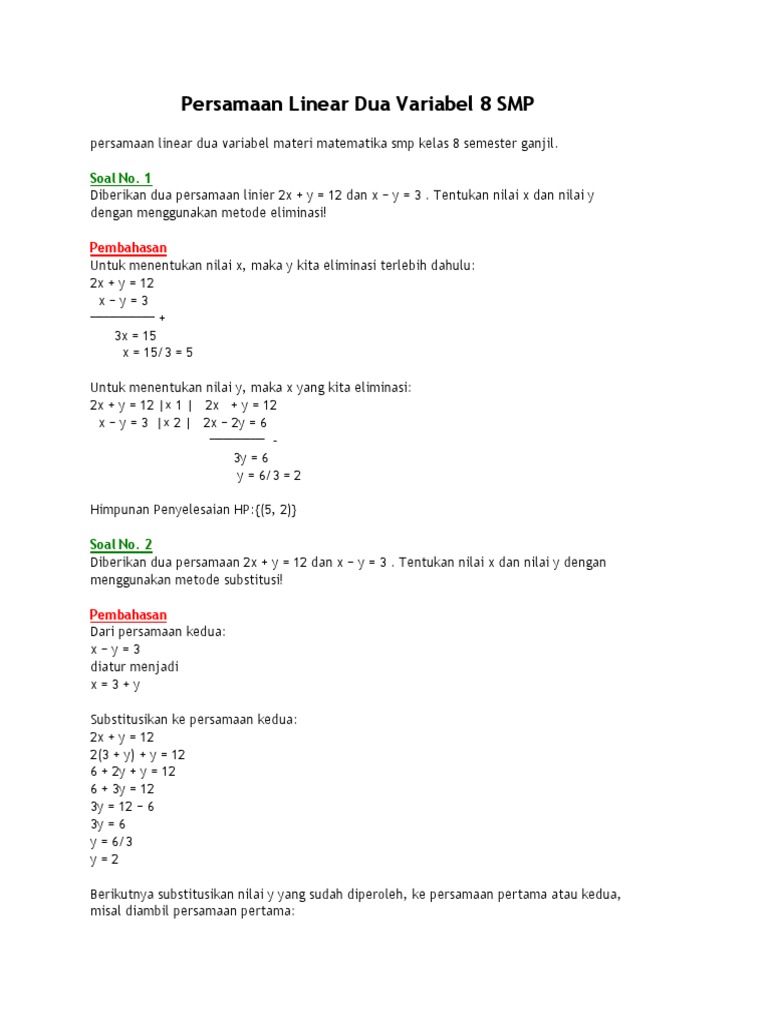 1 diberikan dua persamaan linier 2x y 12 dan x y 3. Untuk beberapa siswa, mempelajari matematika adalah sesuatu yang menakutkan yang senantiasa ditakuti saat sekolah. Mata pelajaran yang terus persis dengan angka & rumus ini berhasil membuat sebagian siswa jadi pusing. Mirisnya lagi, Buat mendapati nilai maksimal di mata pelajaran ini sulitnya meminta ampun. Selama tidak remedial saja sudah harus bersyukur. Sebetulnya belajar matematika tak sesukar yang diasumsikan oleh seluruh orang. Siapa mendalami materi ini, tidak perduli apa satu orang pelajar sekolah atau siapa yang ingin mendapati basic Matematika bikin kehidupannya. Kalaupun Anda mau belajar matematika dengan terancang, cermati tips-tipsnya di bawah ini. Soal matematika smp kelas 8 persamaan linear dua variabel Soal persamaan linear dua variabel spldv soal persamaan linear dua variabel spldv ini terdiri dari 25 butir soal pilihan ganda yang bisa adik adik pelajari langsung di sini. Bagi sebagian siswa, mempelajari matematika merupakan hal yang menakutkan yang senantiasa ditakuti disaat sekolah. Mata pelajaran yang senantiasa sama dengan angka serta rumus ini berhasil bikin beberapa orang jadi pusing. Mirisnya lagi, Bagi mendapati nilai maksimal di mata pelajaran ini susahnya meminta ampun. Asalkan tidak remedial saja telah penting bersyukur. Memang belajar matematika tak sesusah yang dibayangkan oleh seluruhnya orang. Siapa sajakah dapat mendalami materi ini, tidak perduli apa seorang pelajar sekolah atau siapa sajakah yang mau mendapatkan basic Matematika bikin kehidupannya. Jika Anda ingin belajar matematika dengan terancang, simak cara-caranya di bawah ini. Soal matematika smp kelas 8 persamaan linear dua variabel Semoga contoh soal persamaan linear dua variabel spldv dengan kunci jawaban dan pembahasan ini bermanfaat untuk adik adik khususnya yang sudah kelas 8 sekolah menengah pertama smp sltp mts. Untuk beberapa orang, mempelajari matematika adalah hal yang mengerikan yang selamanya ditakuti disaat sekolah. Mata pelajaran yang selamanya sama juga dengan angka & rumus ini berhasil membuat sebagian siswa jadi pusing. Mirisnya lagi, Untuk mendapat nilai maksimum di mata pelajaran ini susahnya meminta ampun. Selamanya tidak remedial saja sudah mesti bersyukur. Memang belajar matematika tak sesulit yang dibayangkan oleh semuanya orang. Siapa pelajari materi ini, tak perduli apa seorang pelajar sekolah atau siapa sajakah yang mau memperoleh basic Matematika untuk kehidupannya. Jika Anda ingin belajar matematika lebih terancang, lihat tips-tipsnya di bawah ini. Soal matematika smp kelas 8 persamaan linear dua variabel