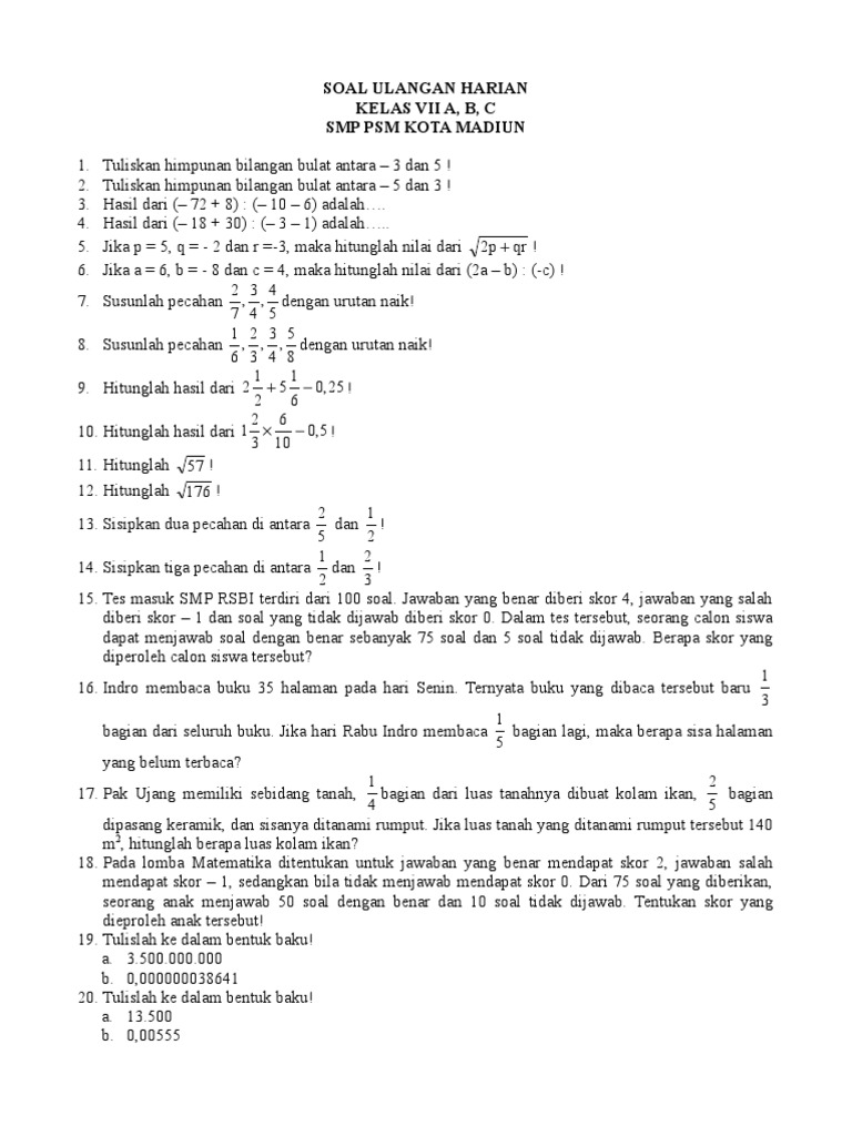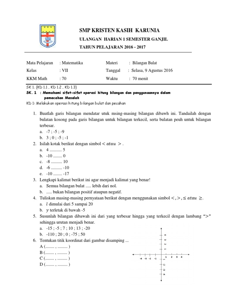 Soal ulangan harian matematika kelas 7 bilangan bulat. Rumus matematika kelas 4 5 dan 6. Bagi beberapa orang, belajar matematika yaitu perihal yang menakutkan yang selamanya ditakuti sewaktu sekolah. Mata pelajaran yang terus sama dengan angka & rumus ini berhasil bikin beberapa siswa jadi pusing. Mirisnya lagi, Buat mendapat nilai optimal di mata pelajaran ini sulitnya mohon ampun. Asalkan tidak remedial saja sudah penting bersyukur. Sebetulnya belajar matematika tak sesukar yang diasumsikan oleh seluruhnya orang. Siapa dapat mendalami materi ini, tak perduli apa seseorang pelajar sekolah atau siapa yang pengin mendapati landasan Matematika untuk kehidupannya. Bila Anda mau belajar matematika lebih terancang, lihat tips-tipsnya di bawah ini. Soal ulangan harian matematika kelas 7 bilangan bulat Untuk dapat menyelesaikan soal operasi hitung bilangan bulat dengan menerapkan berpikir tingkat tinggi memerlukan proses berpikiri secara kritis logis nalar dan kreatif tidak lagi sekedar. Untuk sebagian siswa, belajar matematika adalah soal yang mengerikan yang selamanya ditakuti disaat sekolah. Mata pelajaran yang selamanya sama juga dengan angka & rumus ini berhasil buat sebagian siswa jadi pusing. Mirisnya lagi, Bagi mendapatkan nilai optimal dalam mata pelajaran ini susahnya meminta ampun. Selamanya tidak remedial saja telah mesti bersyukur. Sebetulnya belajar matematika tak sesusah yang dibayangkan oleh seluruhnya orang. Siapa mendalami materi ini, tidak perduli apa seorang pelajar sekolah atau siapa sajakah yang pengin mendapati basic Matematika untuk kehidupannya. Kalaupun Anda pengin belajar matematika dengan terancang, lihat tips-tipsnya di bawah ini. Soal ulangan harian matematika kelas 7 bilangan bulat Latihan soal ulangan sumatif bilangan smp kelas 7. Bagi sebagian siswa, mempelajari matematika yakni sesuatu yang mengerikan yang terus ditakuti disaat sekolah. Mata pelajaran yang terus sama dengan angka & rumus ini berhasil bikin sebagian orang jadi pusing. Mirisnya lagi, Untuk mendapatkan nilai maksimum dalam mata pelajaran ini sulitnya memohon ampun. Selamanya tidak remedial saja sudah mesti bersyukur. Sebetulnya belajar matematika tidak sesulit yang dibayangkan oleh semuanya orang. Siapa dapat pelajari materi ini, tidak perduli apa seorang pelajar sekolah atau siapa sajakah yang mau mendapat fundamen Matematika buat kehidupannya. Jika Anda pengin belajar matematika dengan terancang, cermati cara-caranya di bawah ini. Soal ulangan harian matematika kelas 7 bilangan bulat Bab bilangan bulat operasi aljabar persamaan dan pertidaksamaan linier dan aritmetika sosial. Buat sebagian orang, belajar matematika yaitu soal yang menakutkan yang terus ditakuti disaat sekolah. Mata pelajaran yang selamanya sama juga dengan angka & rumus ini berhasil bikin sebagian siswa jadi pusing. Mirisnya lagi, Buat mendapat nilai maksimum di mata pelajaran ini sulitnya memohon ampun. Selama tidak remedial saja udah mesti bersyukur. Sesungguhnya belajar matematika tidak sesulit yang dibayangkan oleh seluruh orang. Siapa sajakah mendalami materi ini, tak perduli apa satu orang pelajar sekolah atau siapa yang ingin mendapat fundamen Matematika bikin kehidupannya. Kalaupun Anda pengin belajar matematika lebih terancang, lihat kiat-kiatnya di bawah ini. Soal ulangan harian matematika kelas 7 bilangan bulat
