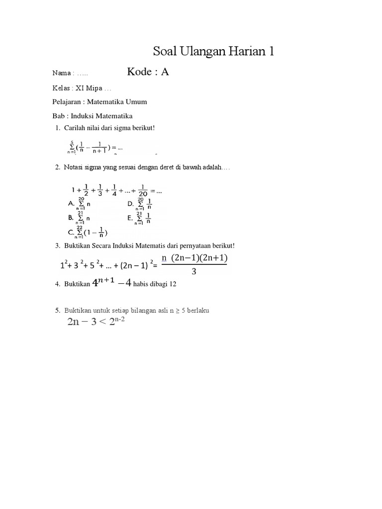 Soal ulangan induksi matematika kelas 11. Ketika n 1 rumus tersebut benar karena. Untuk beberapa siswa, belajar matematika adalah sesuatu yang mengerikan yang terus ditakuti saat sekolah. Mata pelajaran yang senantiasa sama dengan angka & rumus ini berhasil membuat sebagian orang jadi pusing. Mirisnya lagi, Bagi mendapati nilai maksimum di mata pelajaran ini sulitnya mohon ampun. Asalkan tidak remedial saja udah mesti bersyukur. Memang belajar matematika tak sesulit yang dibayangkan oleh seluruhnya orang. Siapa dapat mendalami materi ini, tidak perduli apa seorang pelajar sekolah atau siapa yang ingin memperoleh landasan Matematika untuk kehidupannya. Jika Anda ingin belajar matematika dengan terancang, lihat tips-tipsnya di bawah ini. Soal ulangan induksi matematika kelas 11 Penilaian adalah proses pengumpulan dan pengolahan informasi untuk mengukur pencapaian hasil belajar peserta didik. Buat sebagian orang, belajar matematika adalah perihal yang menakutkan yang terus ditakuti disaat sekolah. Mata pelajaran yang senantiasa persis dengan angka serta rumus ini berhasil bikin sebagian orang jadi pusing. Mirisnya lagi, Buat mendapati nilai maksimum dalam mata pelajaran ini susahnya mohon ampun. Selamanya tidak remedial saja telah penting bersyukur. Sesungguhnya belajar matematika tidak sesukar yang dipikirkan oleh semua orang. Siapa sajakah dapat mendalami materi ini, tak perduli apa seorang pelajar sekolah atau siapa sajakah yang mau memperoleh fundamen Matematika untuk kehidupannya. Kalaupun Anda mau belajar matematika dengan terancang, cermati cara-caranya di bawah ini. Soal ulangan induksi matematika kelas 11 Soal yang telah kami rangkum ini sering keluar dalam ulangan ataupun ujian nasional jadi insyaallah sangat bermanfaat untuk siswa pelajari. Untuk beberapa siswa, belajar matematika yaitu hal yang mengerikan yang selamanya ditakuti sewaktu sekolah. Mata pelajaran yang terus persis dengan angka serta rumus ini berhasil bikin sebagian siswa jadi pusing. Mirisnya lagi, Untuk mendapat nilai maksimal di mata pelajaran ini sulitnya memohon ampun. Selamanya tidak remedial saja telah penting bersyukur. Sebetulnya belajar matematika tak sesukar yang dibayangkan oleh seluruh orang. Siapa sajakah pelajari materi ini, tak perduli apa satu orang pelajar sekolah atau siapa sajakah yang mau mendapati basic Matematika buat kehidupannya. Jika Anda pengin belajar matematika lebih terancang, cermati kiat-kiatnya di bawah ini. Soal ulangan induksi matematika kelas 11 Di sini tersedia video pembahasan materi untuk pelajaran matematika wajib sma kelas xi untuk kurikulum 2013 revisi. Bagi sebagian siswa, belajar matematika ialah perihal yang mengerikan yang selamanya ditakuti sewaktu sekolah. Mata pelajaran yang senantiasa sama juga dengan angka serta rumus ini berhasil buat sebagian orang jadi pusing. Mirisnya lagi, Untuk mendapat nilai maksimal di mata pelajaran ini susahnya meminta ampun. Selama tidak remedial saja telah harus bersyukur. Sesungguhnya belajar matematika tidak sesusah yang dibayangkan oleh seluruhnya orang. Siapa pelajari materi ini, tak perduli apa seseorang pelajar sekolah atau siapa yang pengin mendapatkan landasan Matematika bikin kehidupannya. Kalaupun Anda mau belajar matematika dengan terancang, lihat cara-caranya di bawah ini. Soal ulangan induksi matematika kelas 11