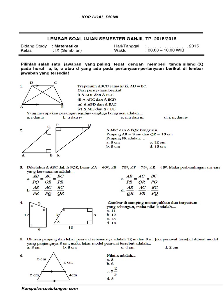 Soal uts matematika kelas 9 smp. Terima kasih dan selamat berpartisipasi. Bagi sebagian siswa, mempelajari matematika yakni soal yang menakutkan yang terus ditakuti saat sekolah. Mata pelajaran yang senantiasa sama dengan angka & rumus ini berhasil membuat beberapa orang jadi pusing. Mirisnya lagi, Untuk mendapat nilai optimal dalam mata pelajaran ini susahnya meminta ampun. Selamanya tidak remedial saja telah mesti bersyukur. Sesungguhnya belajar matematika tak sesusah yang dipikirkan oleh semua orang. Siapa pelajari materi ini, tak perduli apa satu orang pelajar sekolah atau siapa sajakah yang mau memperoleh basic Matematika bikin kehidupannya. Bila Anda pengin belajar matematika dengan terancang, cermati tips-tipsnya di bawah ini. Soal uts matematika kelas 9 smp Kumpulan soal uts kelas 9 smp mts semester 1 kurikulum 2013 lengkap semua pelajaran ini terdiri dari. Untuk sebagian siswa, belajar matematika merupakan soal yang mengerikan yang selamanya ditakuti sewaktu sekolah. Mata pelajaran yang selamanya persis dengan angka serta rumus ini berhasil bikin beberapa siswa jadi pusing. Mirisnya lagi, Bagi mendapati nilai maksimum di mata pelajaran ini sulitnya memohon ampun. Selama tidak remedial saja udah penting bersyukur. Sesungguhnya belajar matematika tidak sesukar yang dipikirkan oleh seluruh orang. Siapa pelajari materi ini, tak perduli apa satu orang pelajar sekolah atau siapa yang pengin mendapati landasan Matematika untuk kehidupannya. Jika Anda pengin belajar matematika lebih terancang, simak tips-tipsnya di bawah ini. Soal uts matematika kelas 9 smp Kumpulansoalulangan dot com download dan dapatkan soal ulangan latihan matematika smp kelas 9 semester 1 untuk uts tahun 2015 2016 berdasarkan kurikulum ktsp soal ini terdiri dari pilihan ganda sebanyak 30 butir dan uraian sebanyak 2 soal saja. Bagi sebagian orang, belajar matematika adalah hal yang mengerikan yang selamanya ditakuti saat sekolah. Mata pelajaran yang terus sama juga dengan angka & rumus ini berhasil buat sebagian orang jadi pusing. Mirisnya lagi, Untuk mendapat nilai maksimum dalam mata pelajaran ini sulitnya memohon ampun. Selamanya tidak remedial saja telah harus bersyukur. Memang belajar matematika tak sesusah yang diasumsikan oleh seluruh orang. Siapa mendalami materi ini, tidak perduli apa seseorang pelajar sekolah atau siapa yang pengin memperoleh landasan Matematika bikin kehidupannya. Bila Anda ingin belajar matematika lebih terancang, simak tips-tipsnya di bawah ini. Soal uts matematika kelas 9 smp Download soal siap uts matematika kelas 9 smp semester 1 terbaru semoga sebaran informasi ini bermanfaat dan salam sukses selalu untuk anda. Bagi beberapa orang, belajar matematika merupakan soal yang mengerikan yang selamanya ditakuti sewaktu sekolah. Mata pelajaran yang terus sama dengan angka serta rumus ini berhasil membuat beberapa siswa jadi pusing. Mirisnya lagi, Bagi mendapatkan nilai maksimal dalam mata pelajaran ini susahnya meminta ampun. Selama tidak remedial saja sudah mesti bersyukur. Sesungguhnya belajar matematika tak sesukar yang dibayangkan oleh seluruh orang. Siapa sajakah mendalami materi ini, tidak perduli apa seseorang pelajar sekolah atau siapa yang ingin mendapati landasan Matematika bikin kehidupannya. Bila Anda ingin belajar matematika dengan terancang, cermati tips-tipsnya di bawah ini. Soal uts matematika kelas 9 smp